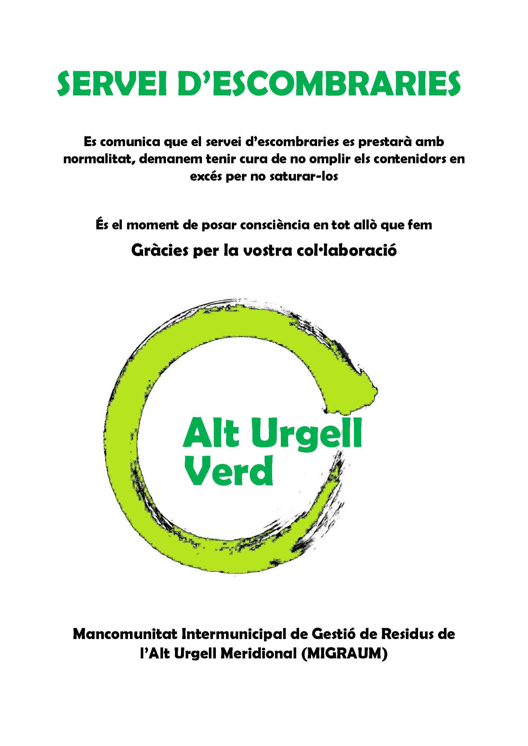 Es comunica que el servei d'escombreries es prestarà amb normalitat.