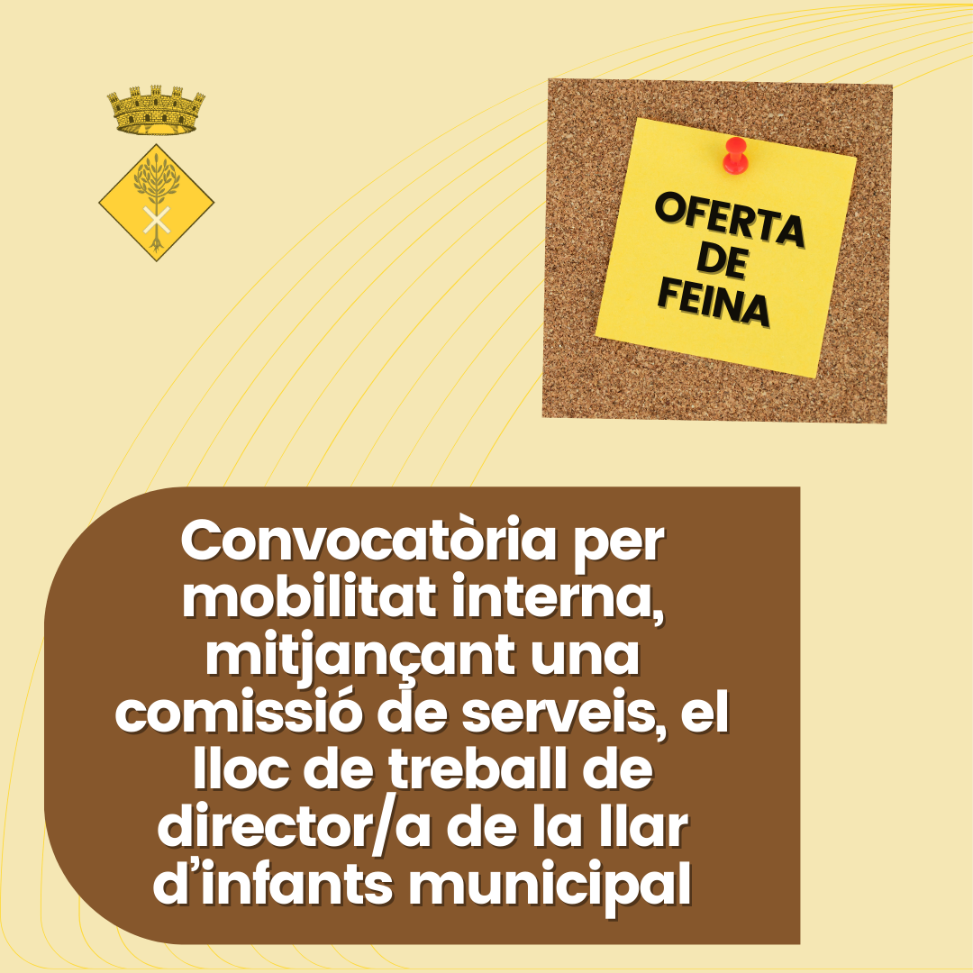 L’Ajuntament d’Oliana té la necessitat de cobrir, per mobilitat interna de personal laboral fix, el lloc de treball de director/a de la llar d’infants municipal, amb caràcter urgent i inajornable.