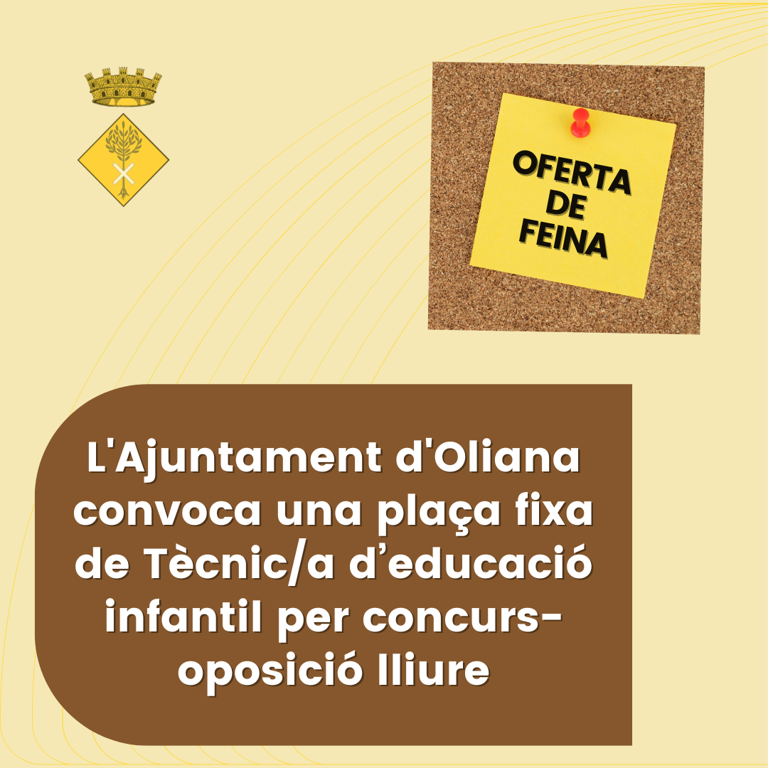 OFERTA DE FEINA: 1 PLAÇA FIXA DE TÈCNIC/A D’EDUCACIÓ INFANTIL MITJANÇANT CONCURS OPOSICIÓ LLIURE, I CREACIÓ D’UNA BORSA DE TREBALL