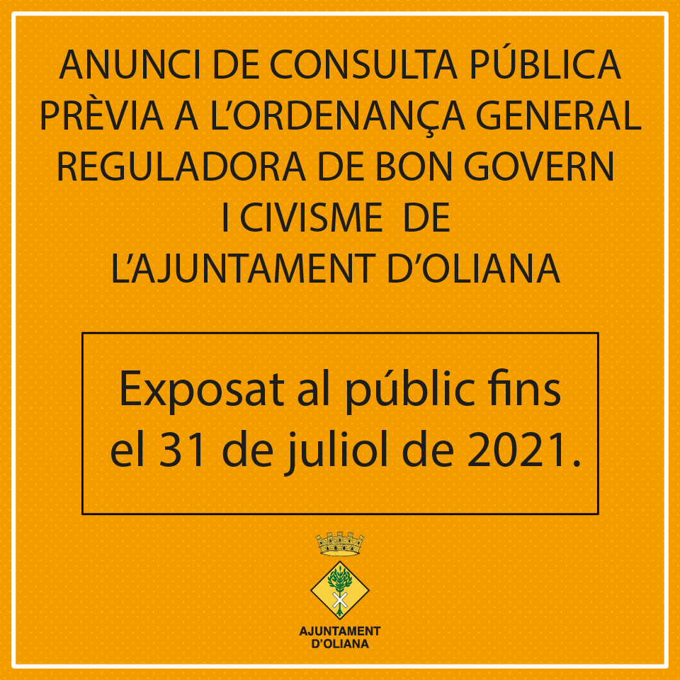 És per aquest motiu que, d’acord amb l’article 133 de la LPAC, es sotmet a consulta pública prèvia la modificació de l’ordenança actual vigent a oliana de bon govern i convivència ciutadana, per recollir l’opinió de la ciutadania i de les organitzacions més representatives que es puguin veure afectades.